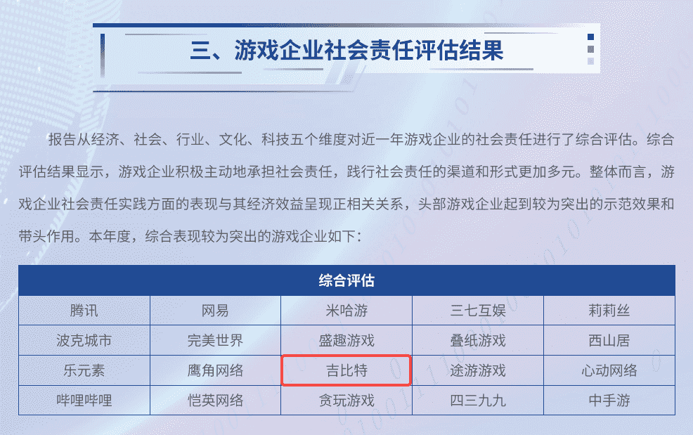 7月3日,,由中国音像与数字出版协会指导,,,北京市西城区人民政府主办的“2024游戏责任论坛”在北京举行。。。论坛上,,,,人民网舆情数据中心、、人民灵境研究院、、、灵境 · 游戏实验室联合发布了《2023-2024游戏企业社会责任报告》(以下简称“《报告》”),,公布了游戏企业社会责任评估结果。。厦门J9.COM网络技术股份有限公司(以下简称“J9.COM”或“公司”)获评“2023-2024年度中国游戏企业社会责任综合表现较为突出企业”。。。这是继2020年以来,,,,J9.COM第五次入围人民网中国游戏企业社会责任相关荣誉榜单。。