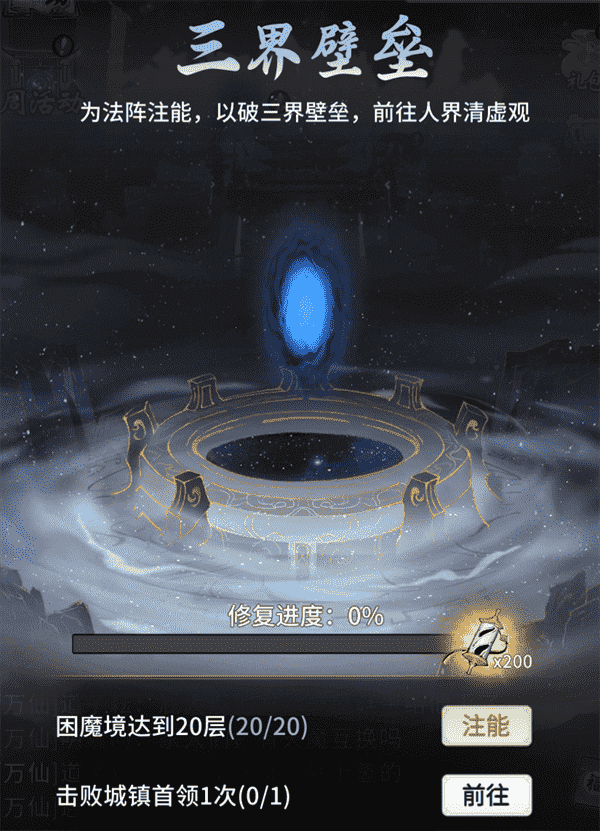 当你修为达到返虚/破虚中期后,,,,可在城镇寻得芸丫并激活神秘法阵,,,,通过收集材料、、、击败首领等方式为法阵注能,,借以打破三界壁垒,,开启支线剧情“清虚旧梦”