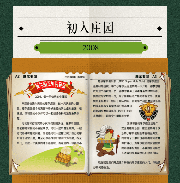 在这一年,,摩尔庄园诞生了。。。。在这里,,,,大家都是可爱的红鼻子鼹鼠小摩尔,,可以一起勤劳耕作,,一起高山滑雪......我们都是摩尔庄园的建设者。。。。