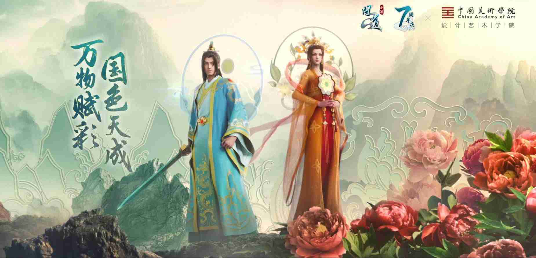 2023年4月,,,《问道手游》联动中国美术学院,,,,在游戏中融合了中国历史上不同时期的文化元素,,,,打造了“山河万象”与“凤鸣九霄”的国风时装。。在色彩配置方面,,创作团队基于对游戏角色特性的分析提取相应的文化内涵,,从每一种色彩的色相、、、指代事物和情感出发对应角色属性,,,,选定服装的色彩搭配。。在纹样设计方面,,创作团队结合游戏角色自身特殊的造型比例和形态,,,在实际的纹样设计中进行了游戏语境下的活化演绎。。。。男性角色集中使用了如蟒纹、、、海水江崖纹、、、、如意纹和云气纹等传统纹样元素,,,,女性角色则吸纳了凤凰纹、、、牡丹纹、、、卷草缠枝纹等元素,,,,组成以“双凤牡丹纹样”“缠枝牡丹纹”“金玉凤冠头饰”为主要纹样的游戏角色装饰图案系统。。。。