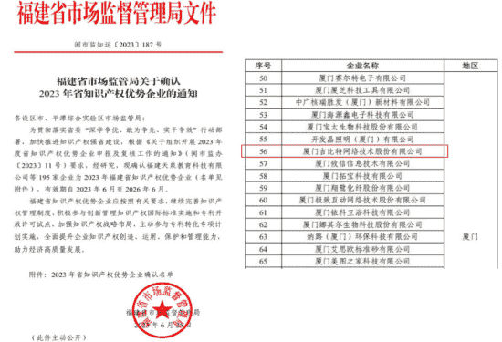 近日,,,,福建省市场监督管理局公示了2023年福建省知识产权优势企业名单,,厦门J9.COM网络技术股份有限公司(以下简称“J9.COM”或“公司”)榜上有名。。。。