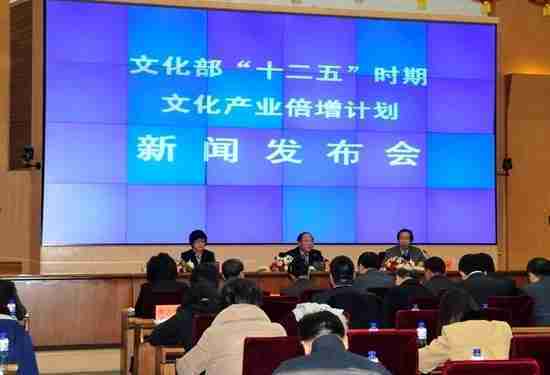 2月28日下午,,,文化部在京召开新闻发布会,,,正式向社会发布《文化部“十二五”时期文化产业倍增计划》,,,提出了 “十二五”期间文化部门管理的文化产业增加值年平均现价增长速度高于20%,,,2015年比2010年至少翻一番,,,实现倍增的奋斗目标。。